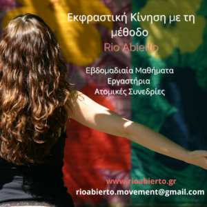Βασικό στοιχείο της μεθόδου Rio Abierto είναι τα μαθήματα Εκφραστικής Κίνησης. Σε αυτά ανοίγουμε σταδιακά στη ροή και την ελευθερία του σώματος, καθώς αυτό χαλαρώνει μέσα στην κάθε κίνηση, αισθάνεται ξανά ζωντανό και αποκτά σταδιακά πλαστικότητα και εκφραστικό πλούτο. Σε κάθε μάθημα στόχος μας είναι η σωματική, συναισθηματική, ψυχική και ενεργειακή εναρμόνιση μας (σώμα- καρδιά-νους). Τα μαθήματα συνοδεύουν υπέροχες μουσικές, μια ευρεία γκάμα ψυχοσωματικών εργαλείων έκφρασης και κυρίως η δημιουργία ενός ασφαλούς χώρου εκφρασης και αποδοχής του Εαυτού μας.